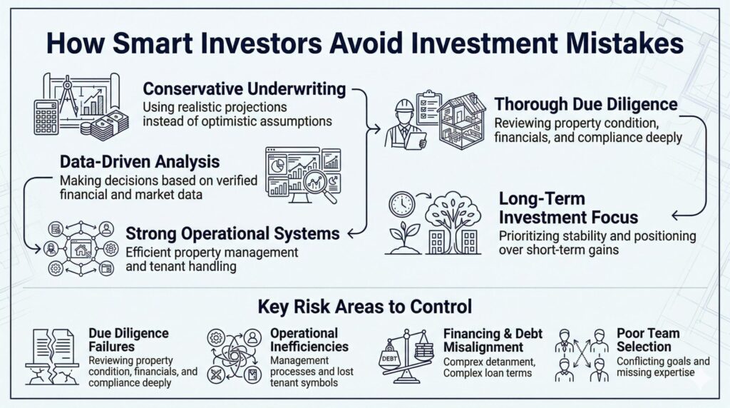 Avoiding real estate investing mistakes to avoid starts with adopting a disciplined approach. This includes conservative underwriting, detailed due diligence, realistic projections, and working with experienced professionals. Successful investors focus on minimizing downside risk rather than chasing aggressive upside scenarios.