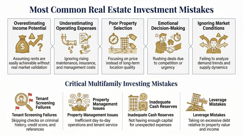 The most common real estate investment mistakes include overestimating rental income, underestimating operating expenses, and failing to conduct proper due diligence. Many investors also make emotional decisions, rush into deals due to competition, or rely too heavily on optimistic projections. These mistakes often seem small initially but can significantly impact long-term returns.